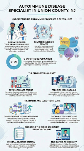 - Rheumatologists are the primary autoimmune disease specialists serving Union County and nearby New Jersey areas.